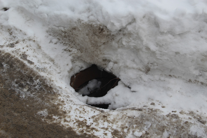 Наиболее опасный участок для водителей и пешеходов расположился у дома №31/45 на Геофизической, здесь кроме глубоких ям своих жертв поджидает открытый смотровой колодец, частично скрытый сугробом. Попытка обойти наледь по снегу может привести к печальным последствиям, особенно в темное время суток.