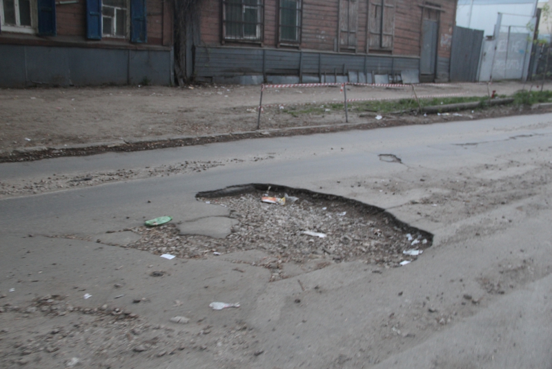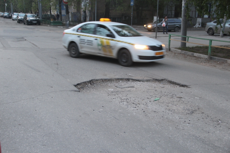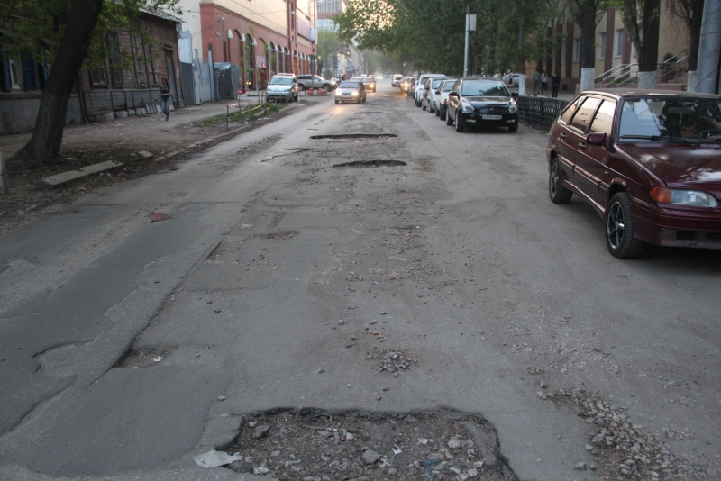 Наиболее впечатляет выбоина, находящаяся сразу после пересечения с улицей Пугачева. Она расположилась по кромке восстановленного после вскрытия дорожного полотна. В будние дни, когда дороги заняты припаркованными автомобилями, объехать это препятствие не представляется возможным.