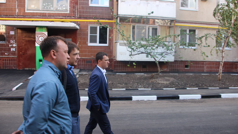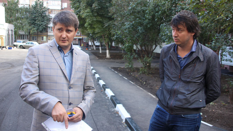 Первый замглавы Октябрьского района Андрей Мазлов, замглавы по благоустройству Родион Халимов, осуществляющий контроль за работами, а также Сергей Андронов, руководитель Поволжского учебно-исследовательского центра «Волгодортранс» при СГТУ, продемонстрировали директору «Дорожного контроля» и «Четвертой власти» Николаю Гурину качество уложенного во дворе асфальтобетонного покрытия.