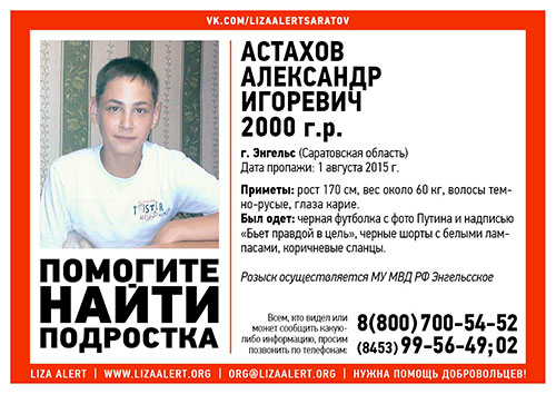 Всем, кому что-либо известно о местонахождении Александра Астахова, просьба звонить по телефонам: 8 (800) 700-54-52, (8453) 99-56-49 или 02.