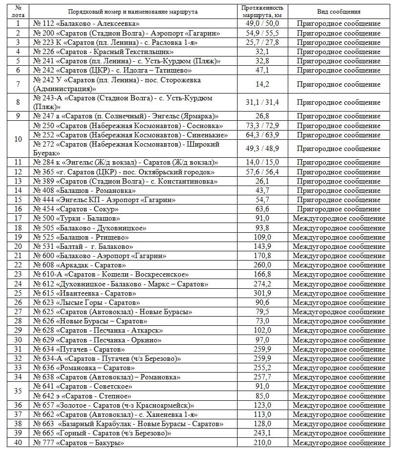 Открытый конкурс нацелен на то, чтобы найти перевозчиков по маршрутам регулярных перевозок на территории региона. В список вошли маршруты пригородного сообщения, например, №112 «Балаково – Алексеевка», №200 «Саратов (Стадион Волга) – аэропорт Гагарин», №226 «Саратов – Красный Текстильщик» и др.