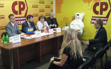 «Как видите, главного оппонента приходится тащить за уши», - заявил глава регионального отделения «СР» Алексей Полещиков, принес игрушечного медведя и усадил его в кресло. «Он с ромашкой, гламурный. Кто-нибудь хочет сфотографироваться?», - спросила депутат областной думы от КПРФ Ольга Алимова и добавила: «Правда, язык показывает, непонятно, кому».