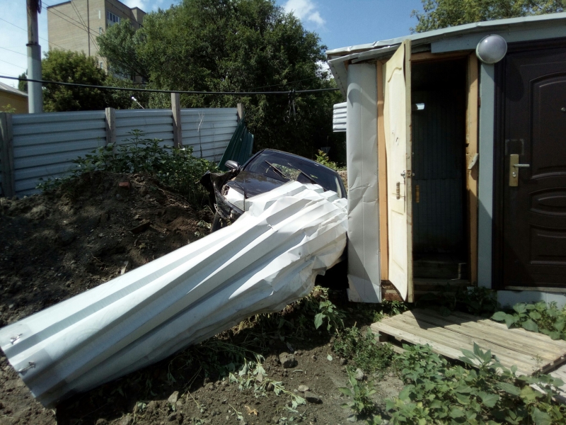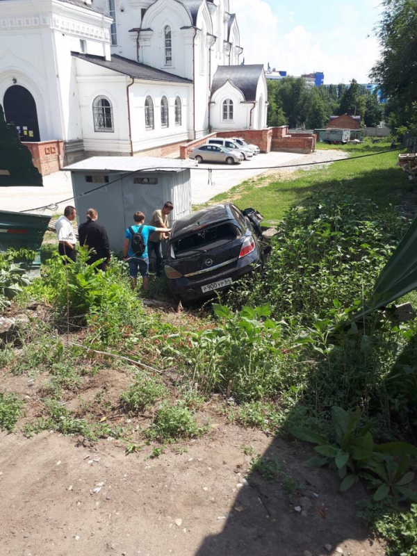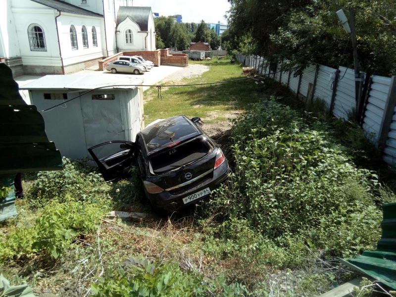 По рассказам очевидцев, водитель был нетрезв. Иномарка снесла забор, скатилась с горки на территорию храма, протаранив по пути уличный туалет.