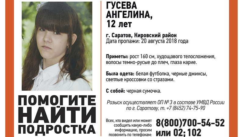 Если у вас есть информация о местонахождении Ангелины, просьба позвонить по телефонам: 8 (8452) 74-75-90 (отдел полиции №3), 8 (800) 700-54-52 («Лиза Алерт») или 02 (с сотового 102).