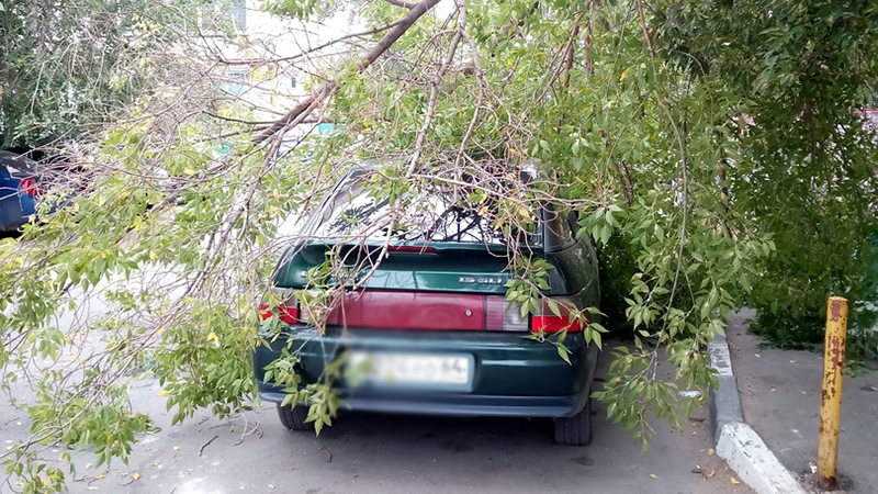 По словам горожан, происшествие случилось на улице Мичурина. На опубликованных снимках видно, что на «ВАЗ-2112» свалилась огромная ветка дерева. Серьезных повреждений у машины не видно, поскольку ветка отломилась не до конца.