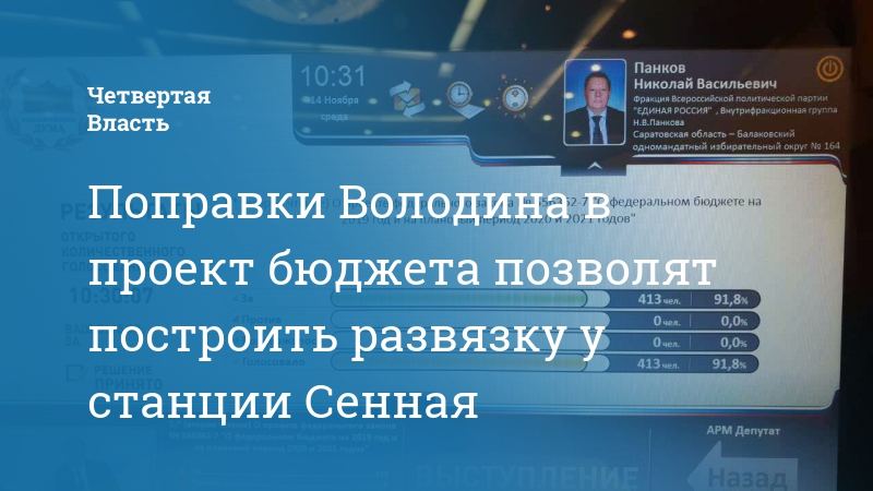 «Пленарное заседание снова ожидается жарким. Рассматривается в основном, втором чтении проект федерального бюджета на три года. К законопроекту поступило 462 поправки, из них 200 от депутатов. Все принимали участие в работе над законопроектом, и в думе, и в регионах. Для нашей области сегодня особый день. Уже говорил о важных поправках, внесенных по инициативе председателя Госдумы Вячеслава Володина для решения наболевших проблем региона. Во-первых, строительство объездной дороги у станции Сенная. Здесь пересекаются две крупные магистрали – автомобильная и железнодорожная. Поток транспорта, особенно летом, в период отпусков, огромный. Пробки у переезда – многолетняя головная боль автомобилистов. Это потеря времени, неудобство для людей, опасные ситуации на дороге. Для бюджета области строительство развязки – нагрузка непосильная. И как всегда, Володин включил в федеральный бюджет строительство этого и ряда других важных объектов инфраструктуры. Всегда берется за те проблемы, перед которыми отступают другие. И решает их на благо людей», - написал Панков.