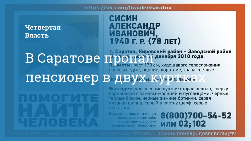 В Саратове пропал 78-летний Александр Сисин. Об этом сообщает поисковый отряд «Лиза Алерт».