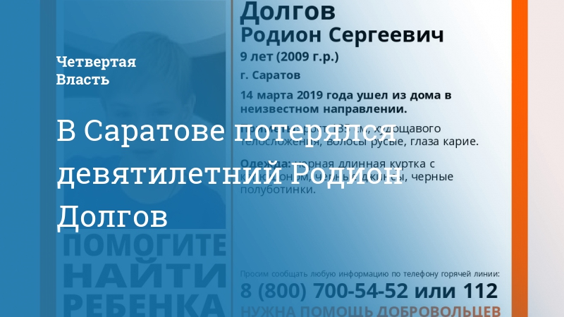 В Ленинском районе Саратова пропал девятилетний Родион Долгов. Об этом сегодня, 15 марта, сообщает поисковый отряд «Лиза Алерт».