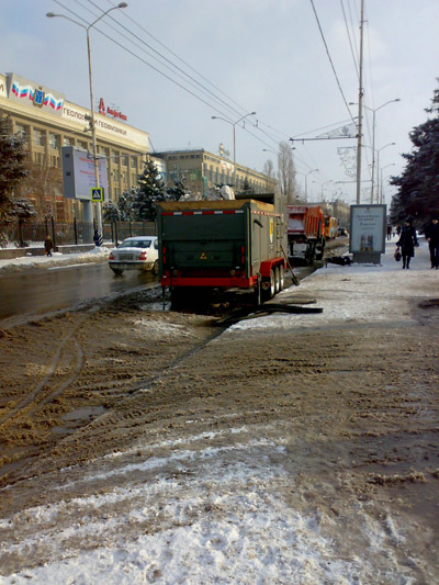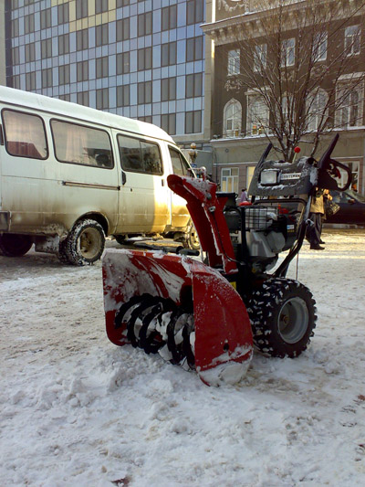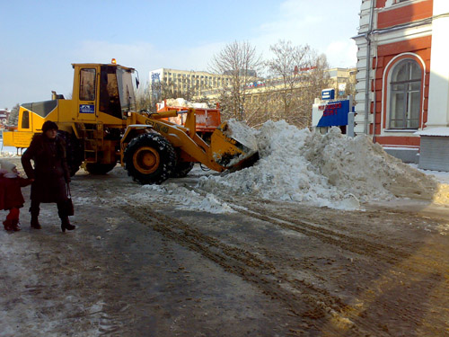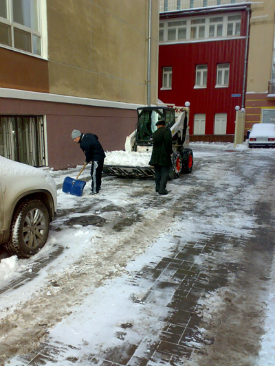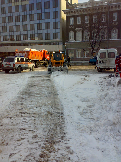 В остальных местах спецтехника попадалась на пути журналиста в основном поблизости от органов власти. Так, во дворе здания минстроя мини-экскаватор чистит парковочные места для служебных автомобилей. Важностью такой работы проникся, по-видимому, кто-то из чиновников. Не испугавшись угрозы испачкаться, он прямо в официальной одежде схватился за лопату.