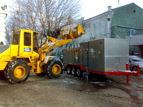 Самое массовое скопление спецтехники журналист обнаружил на Театральной площади. Сюда же подогнали две снегоплавильные печи, однако работает всего одна. С другой у специалистов возникли какие-то трудности в обслуживании. В простое также еще несколько единиц техники.