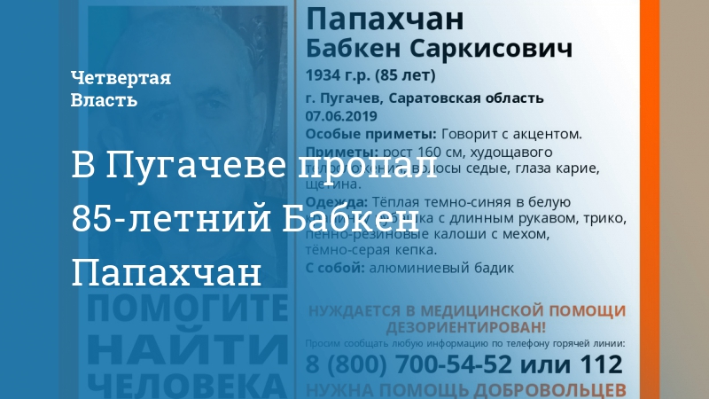 В Пугачеве Саратовской области пропал 85-летний Бабкен Папахчан. Волонтеры поискового сообщества «Лиза Алерт» сообщили, что мужчину последний раз видели 7 июня.