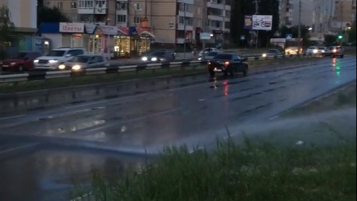 На кадрах видно, что мощная струя из трубы бьет на полосы движения в сторону улицы Топольчанской (в районе дома №24Б).