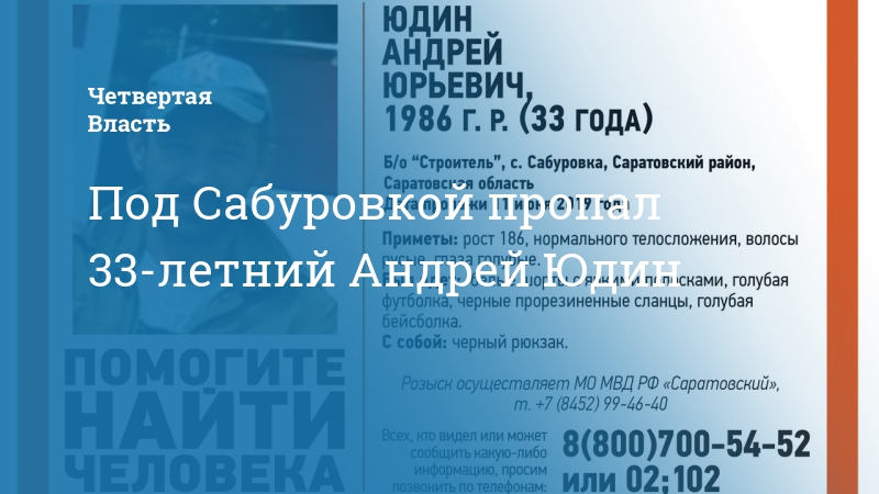 Если у кого-либо есть сведения о местонахождении Юдина, просьба позвонить по телефонам: 8 (800) 700-54-52 («Лиза Алерт») или в полицию 02 (с сотового 102).