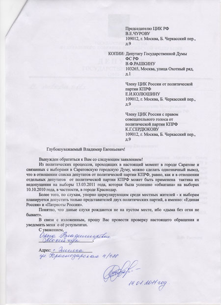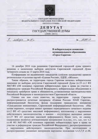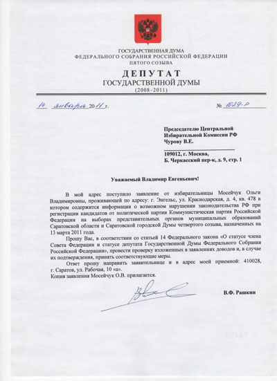 Депутат Государственной Думы РФ от партии КПРФ Валерий Рашкин направил депутатский запрос на имя председателя ЦИК РФ В.Е. Чурова с просьбой провести проверку по информации о возможном недопущении ряда кандидатов компартии к грядущим выборам в городскую думу Саратова при регистрации. Поводом для обращения послужила копия заявления избирательницы Ольги Мосейчук на имя главы избиркома, поступившая в приемную депутата.