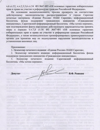 Отметим, что это не первый запрос Рашкина на тему грядущих выборов. Ранее парламентарий обращался в избирательную комиссию Саратова с просьбой провести проверку по распространению в городе печатных материалов: «Единая Россия» НАШ Саратов», информационного бюллетеня фонда поддержки гражданских инициатив «Гражданские инициативы» и Саратовский информационный бюллетень «Мы хотим перемен». Эти издания, имеющие все признаки периодического печатного издания, по мнению коммунистов, изготовлены с нарушением действующего законодательства, поскольку в них отсутствуют выходные данные. Кроме того, статьи содержат материалы агитационного характера.