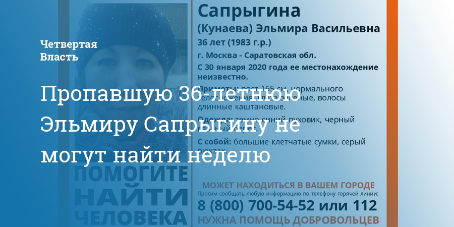 Пропавшую 36-летнюю Эльмиру Сапрыгину не могут найти неделю