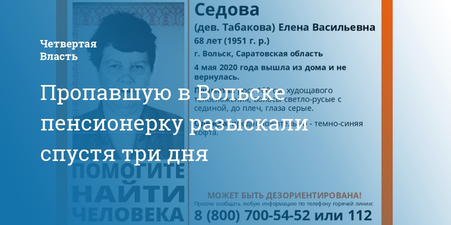 В Вольске Саратовской области найдена живой пропавшая без вести 68-летняя Елена Седова (Табакова). Об этом сообщили волонтеры поискового отряда «Лиза Алерт».