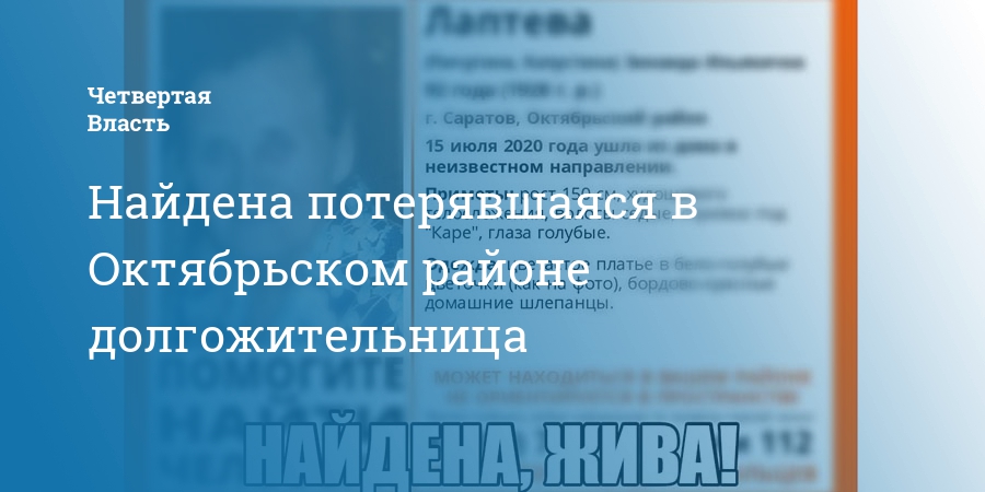 В Октябрьском районе Саратова обнаружена живой пропавшая сегодня долгожительница Зинаида Лаптева (Пичугина, Капустина). Об этом сообщает поисковый отряд «Лиза Алерт».