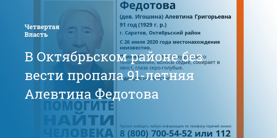 В Октябрьском районе Саратова без вести пропала 91-летняя Алевтина Федотова (Игошина). Об этом сообщают волонтеры отряда «Лиза Алерт».