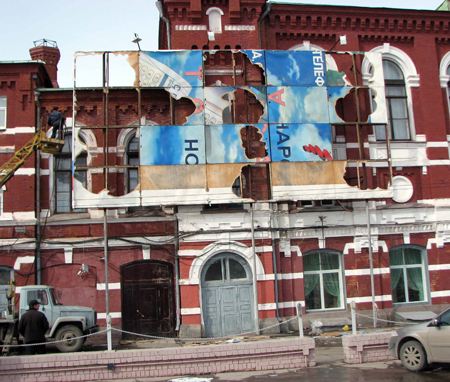 В Саратове со здания областной научной библиотеки на театральной площади демонтировано незаконно установленное брандмауэрное панно