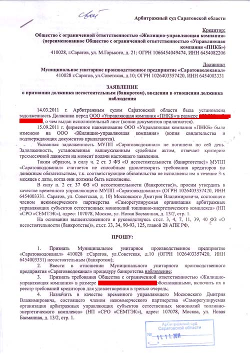 11 ноября управляющая компания «ПНКБ» (ныне - ООО «ЖУК») обратилась в Арбитражный суд Саратовской области с просьбой признать МУПП «Саратовводоканал» банкротом, копия заявления появилась на ЖЖ саратовского юриста Павла Дуксина. Вчера заявление передано в производство судье Чиркову.