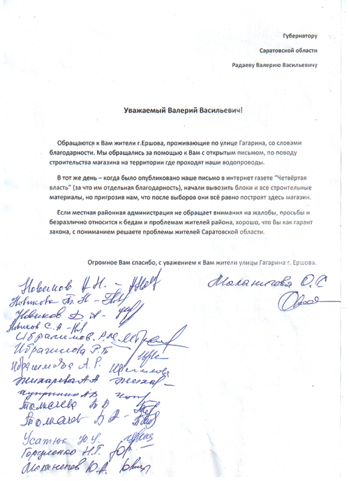 Открытое письмо на имя главы региона было опубликовано на нашем сайте 16 июля 2013 года. Ершовцы, проживающие в домах №1, №2, №3, №4/6, №8 по улице Гагарина, написали, что над их водоводом началось строительство торгового павильона.