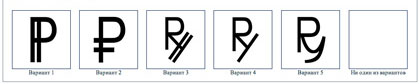 Банк России на своем сайте предлагает всем желающим проголосовать за символ рубля. Рабочая группа рассмотрела более тысячи обращений от частных лиц и организаций, предложивших графическое изображение национальной валюты. Комиссия отобрала пять вариантов.