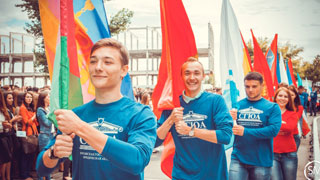 Завершилась торжественная линейка парадом флагов регионов РФ и иностранных государств, чьи представители поступили в этом году в вуз, праздничным салютом, под который студенты из творческих коллективов исполнили гимн академии.