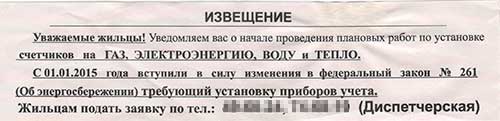 Потом в «извещении» идет отсылка на изменения в федеральном законе №261 «Об энергосбережении», вступившие в силу с 1 января 2015 года. При этом читателям письма вменяется, что это закон, «требующий установку приборов учета».