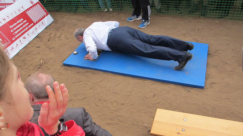 Валерий Радаев решил проверить свои силы, снял пиджак и принял упор лежа. Тренер ему рассказал, что в его возрасте для сдачи норм ГТО достаточно отжаться 10 раз. Губернатор выполнил упражнение буквально на одном дыхании, причем отжался 25 раз.