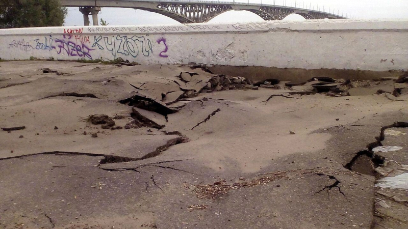 Сегодня на Набережной Космонавтов в районе дикого пляжа саратовцы могут наблюдать груды раскуроченного асфальта и обнажившиеся бетонные плиты. В трещинах между плитами можно услышать, как шумит река.