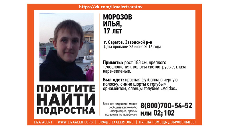 В группе поискового отряда «Лиза Алерт» размещено объявление о розыске Ильи Морозова