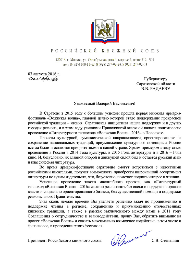Президент Российского книжного союза Сергей Степашин направил обращение к губернатору Саратовской области Валерию Радаеву. В письме на имя главы региона он в очередной раз отметил важность проекта Приволжской книжной палаты - «Волжская волна – 2016».