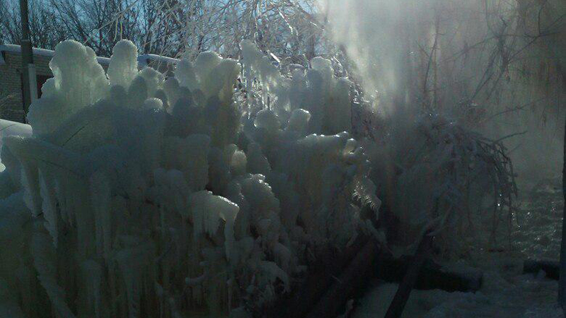 На фотографиях, которые пользователь приложил к своему посту, видны струя горячей воды, бьющая из прорвавшейся трубы, а также покрытые толстым слоем льда тротуар и растущие неподалеку кусты.