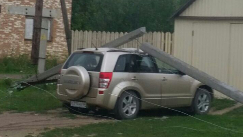 По сообщениям в соцсетях местных жителей, ветер повалил железобетонный столб. Он рухнул на «Сузуки Гранд Витара» и переломился пополам. Кроссовер получил технические повреждения.