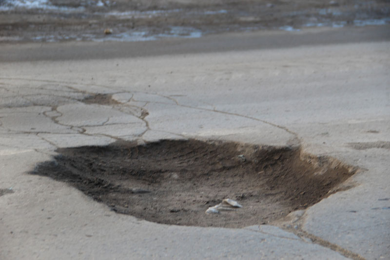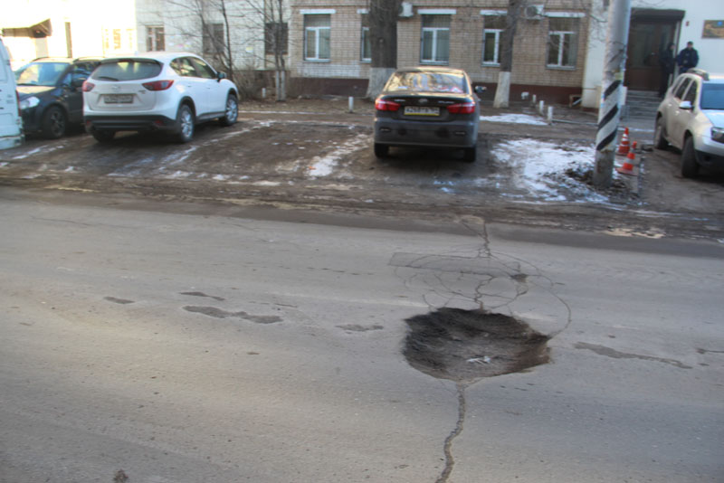 Многочисленные трещины протянулись от ям на всю ширину проезжей части, что свидетельствует о продолжающемся разрушении дорожного покрытия.