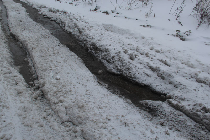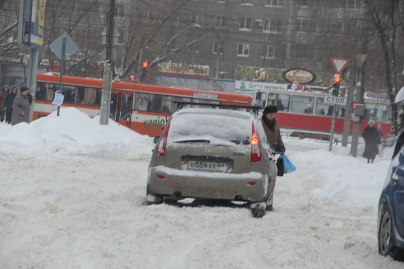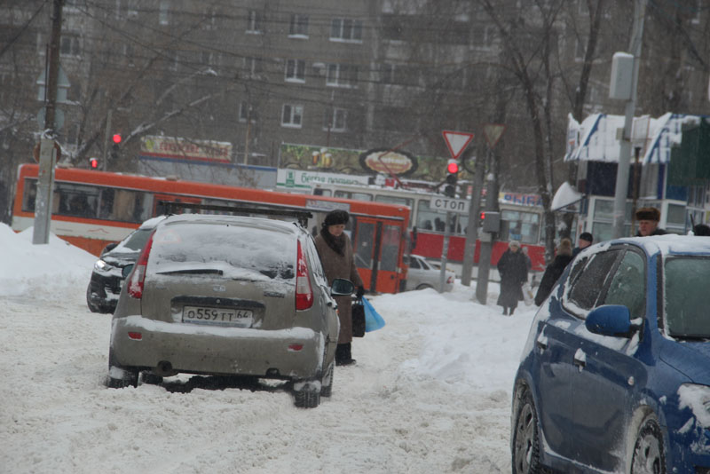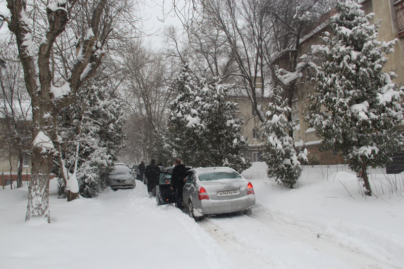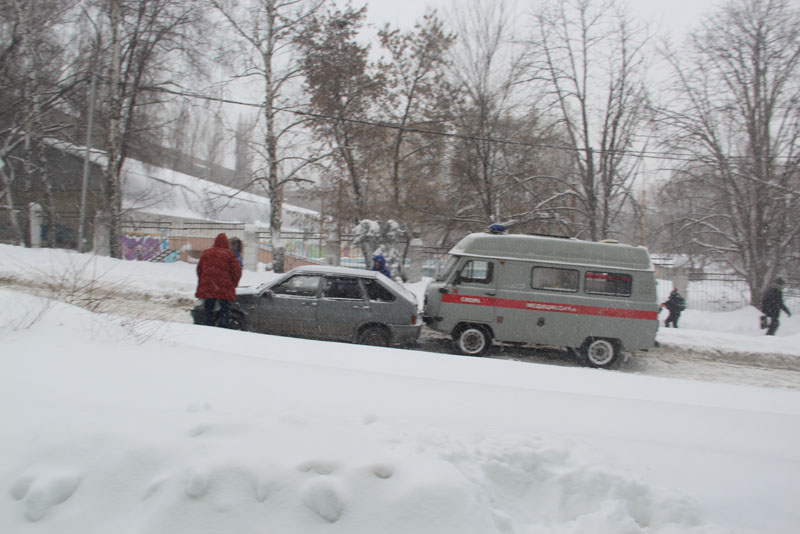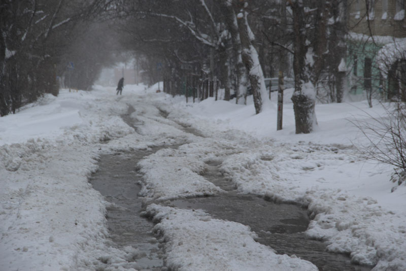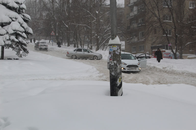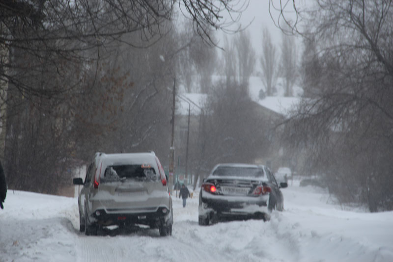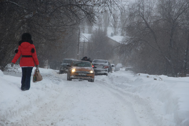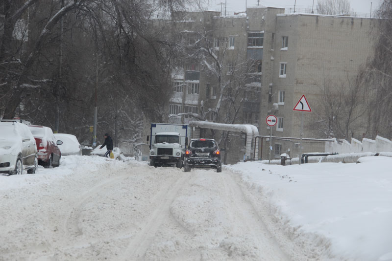 Улицу Курдюмскую заливает из-за порыва коммуникаций у дома 73А, и для движения по снежной каше и ледяным наростам, которые никто не убирает больше недели, есть только одна полоса. Проехать по ней не рискнул бы и владелец внедорожника. Попытка водителя седана спуститься по улице Вишневой, куда течет вода с Курдюмской, не увенчалась успехом, автомобиль завяз в сугробе, вокруг него внедорожники накатали новую колею. На улице Офицерской движение транспорта осуществляется только в одну колею. По сути, это единственная дорога, где хоть как-то движется транспортный поток. Но встречным потокам на одной полосе разъехаться крайне сложно.