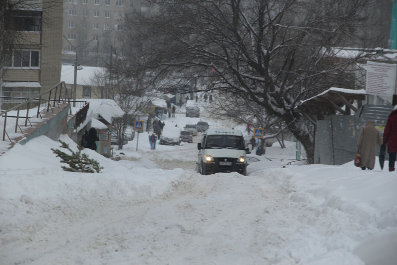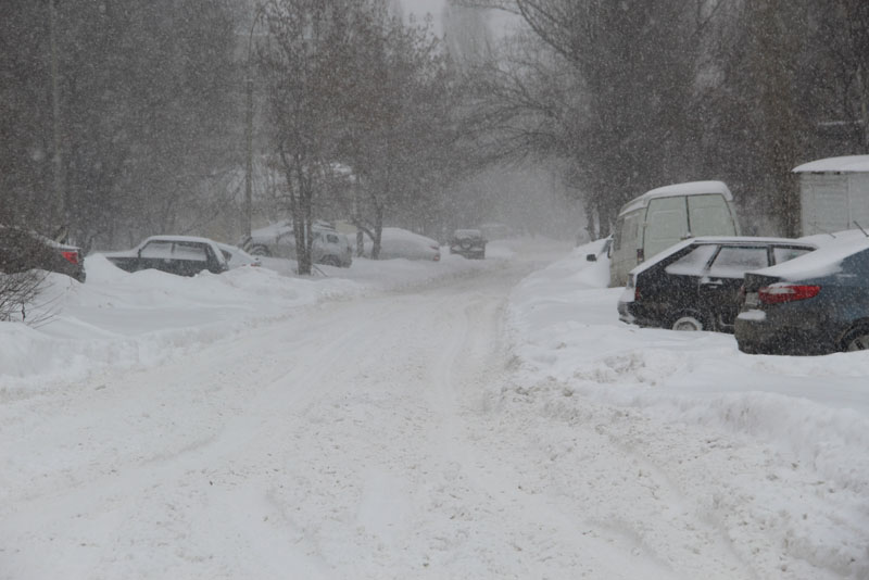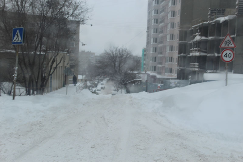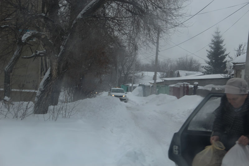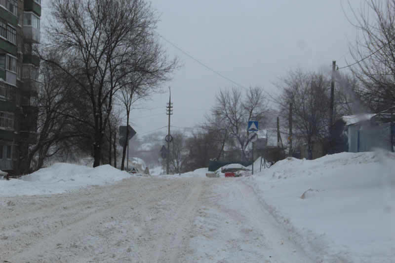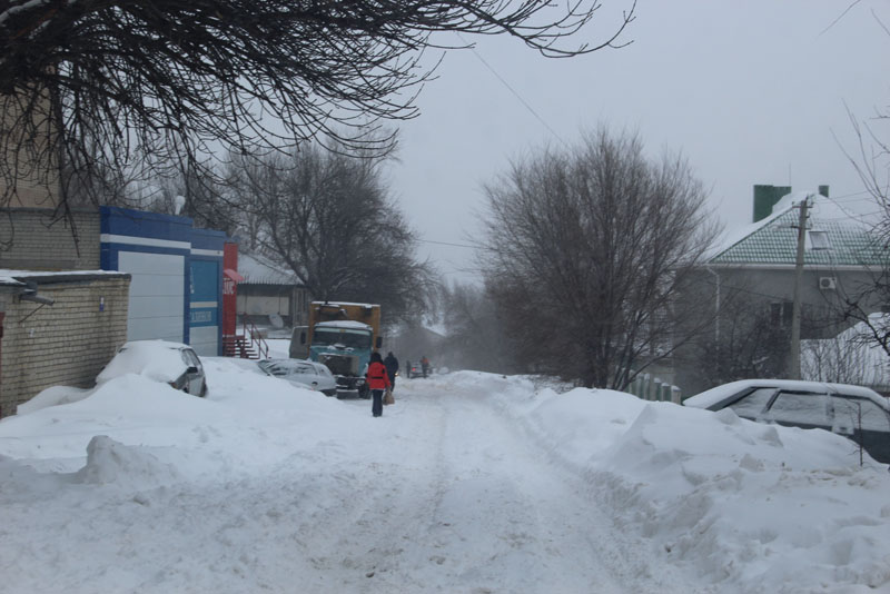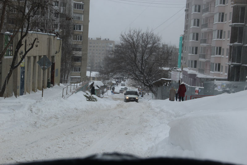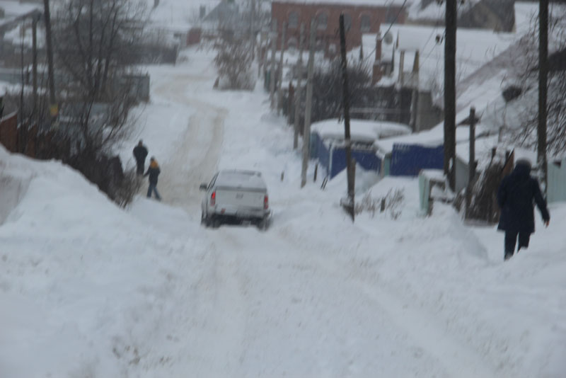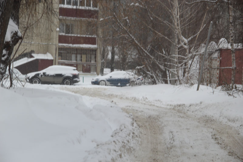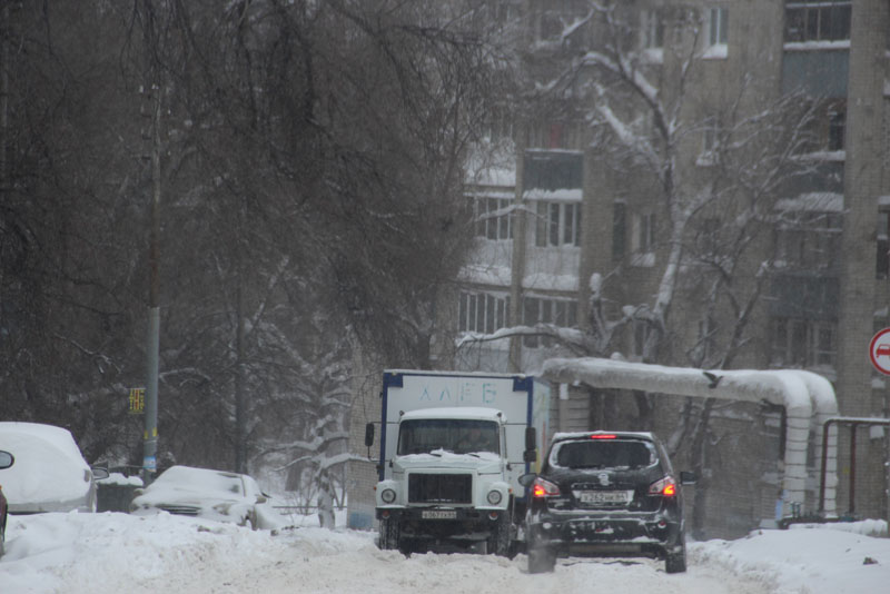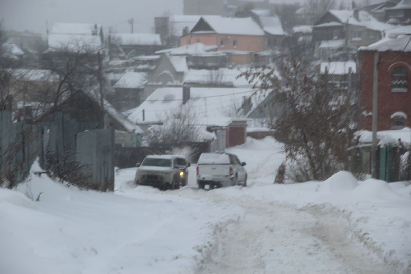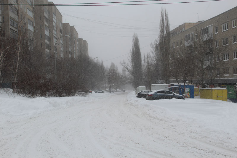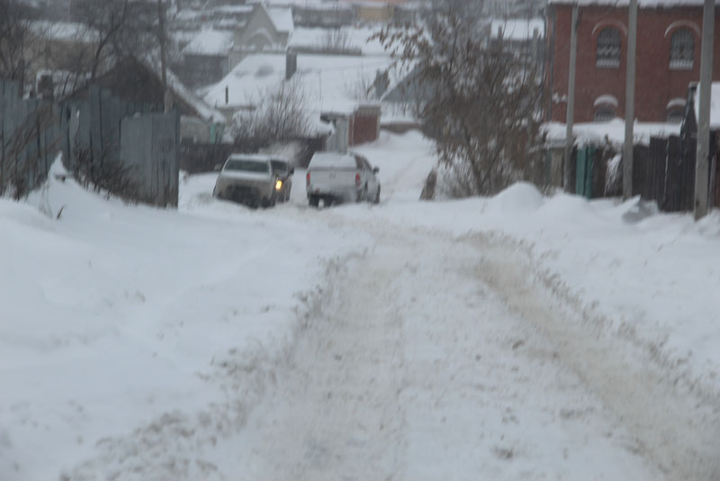 Генерала Захарова. Дорога не расчищена, но движение осуществляется в обе стороны. Появляются седаны и другие легковые автомобили
