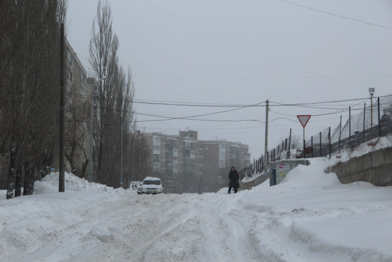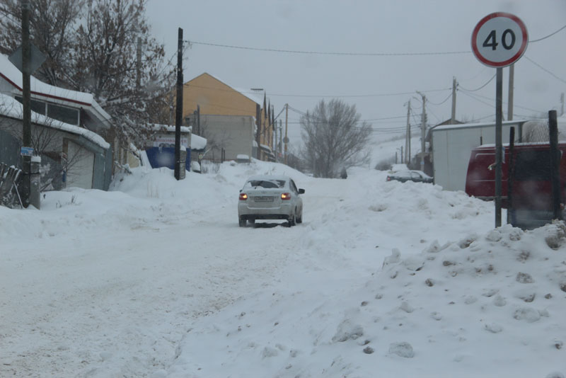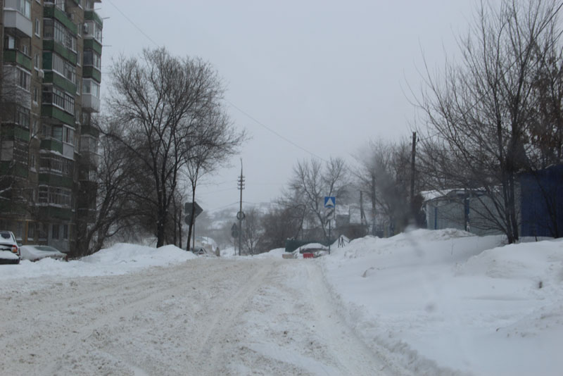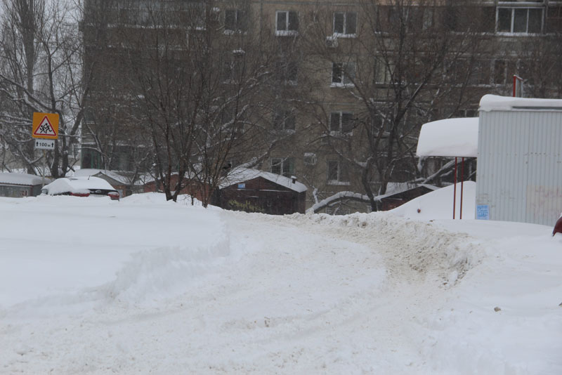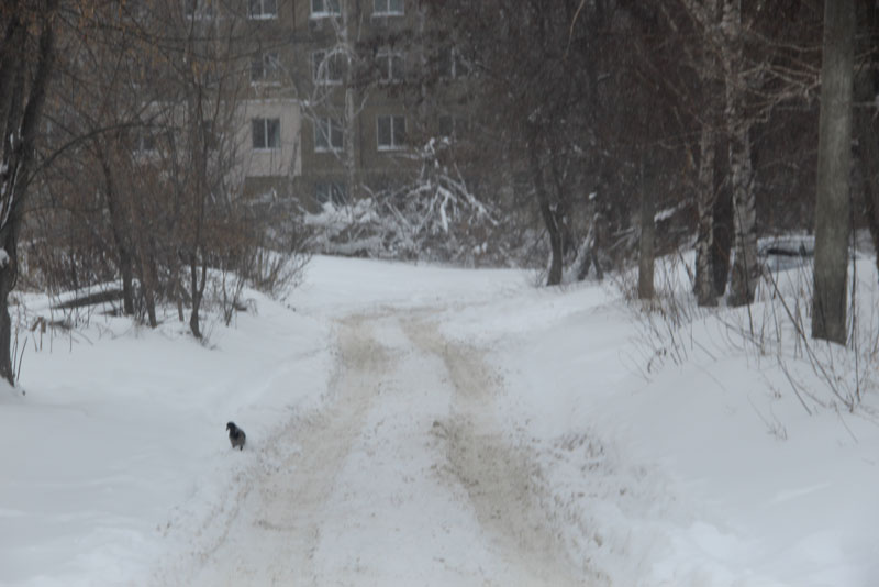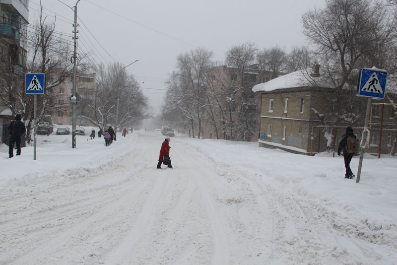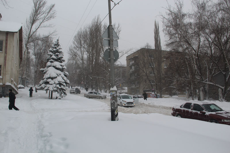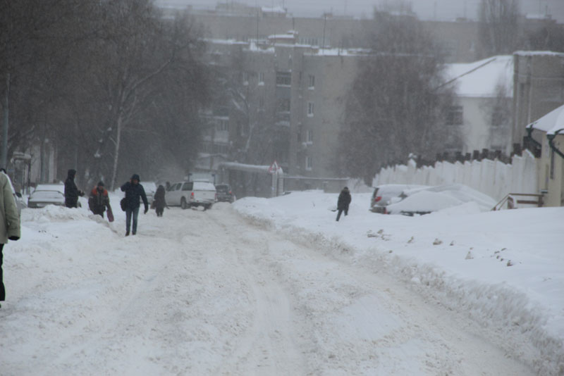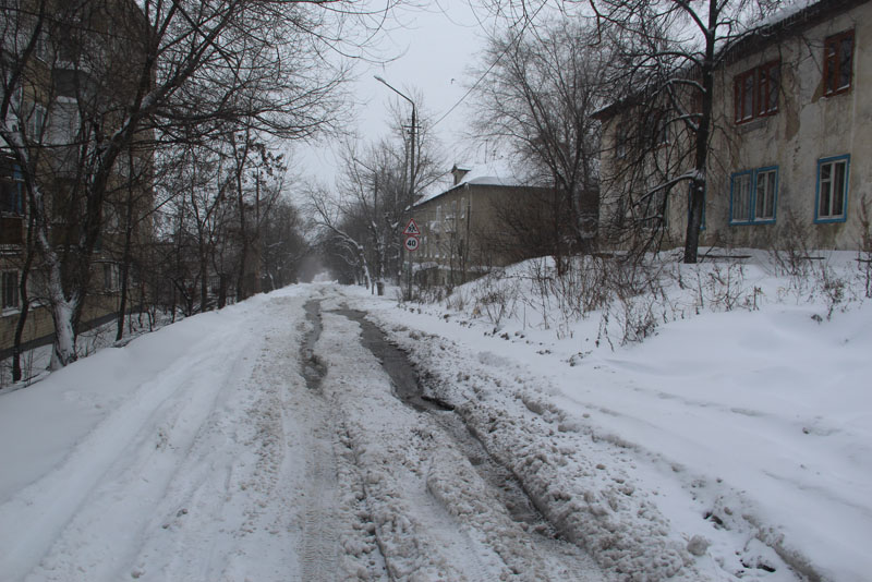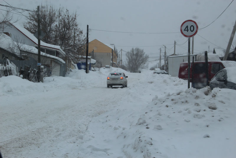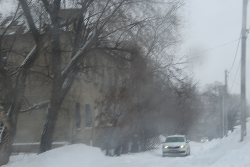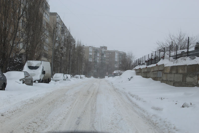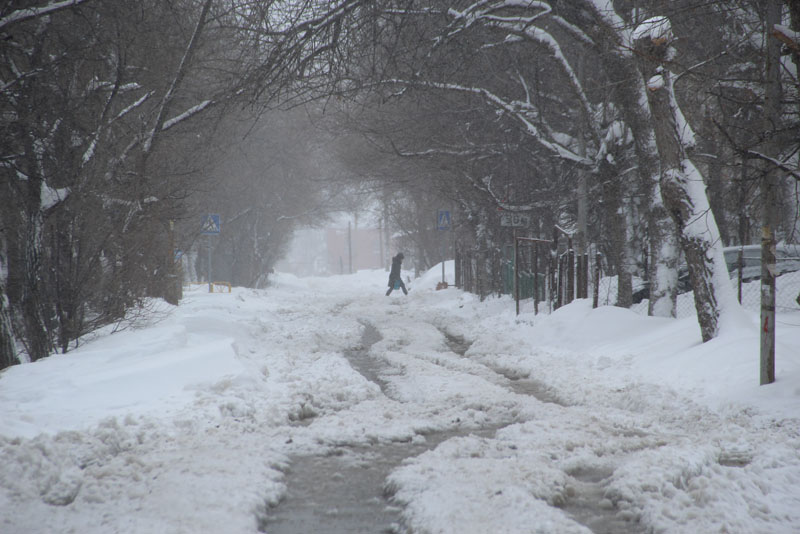 Генерала Захарова. Дорога не расчищена, но движение осуществляется в обе стороны. Появляются седаны и другие легковые автомобили