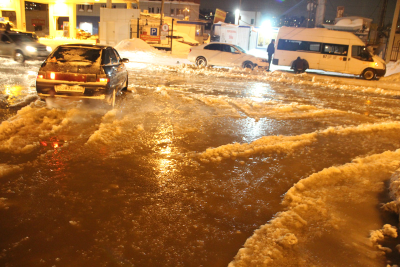 На самом деле Елена поскромничала, ширина «озера» в районе Перспективной была значительно больше. Вода затопила на Тархова две дороги с двумя полосами. Проезжая часть в сторону Бардина из-за мощного излива воды превратилась в полигон для испытания военной техники. Глубокие промоины в ледяном поле, покрытом снежной кашей, бросали вызов скопившемуся транспорту. Водители безжалостно убивали подвеску своих авто в попытках преодолеть перекресток с Перспективной. Удавалось это далеко не всем, машины буксовали, бились днищем, застревали , садились на пузо, останавливая и без того еле крадущийся поток транспорта.