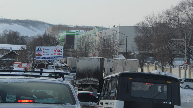 В образовавшейся пробке оказались и маршрутные такси, двигающиеся по этой улице.