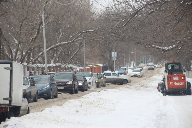Лишь приехавший бобкет попытался хоть как-то расчистить проезжую часть и тротуар от выпавшего снега, но его сил для уборки дороги и освобождения ее от наледи явно недостаточно.