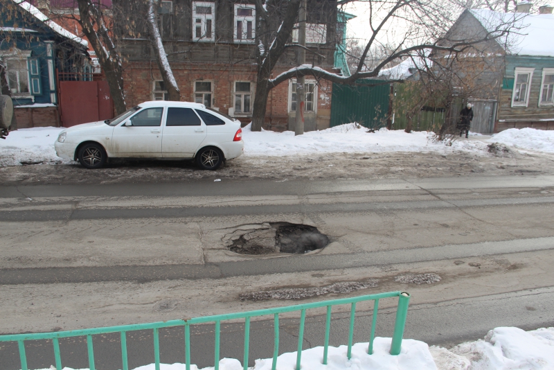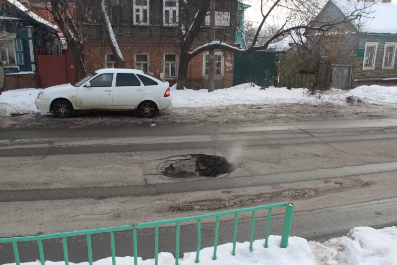 Провал возник посередине проезжей части на улице Пугачева на участке между 1-й Садовой и Соколовой. Опасная яма находится напротив здания городской станции по борьбе с болезнями животных.