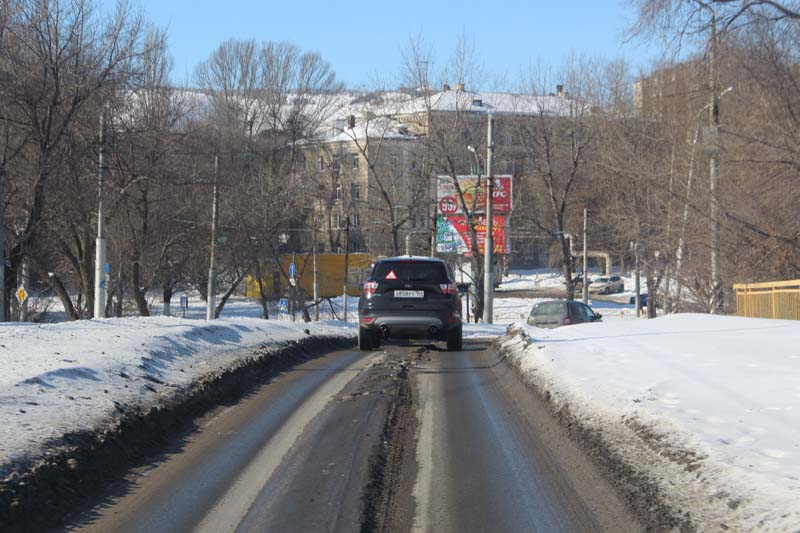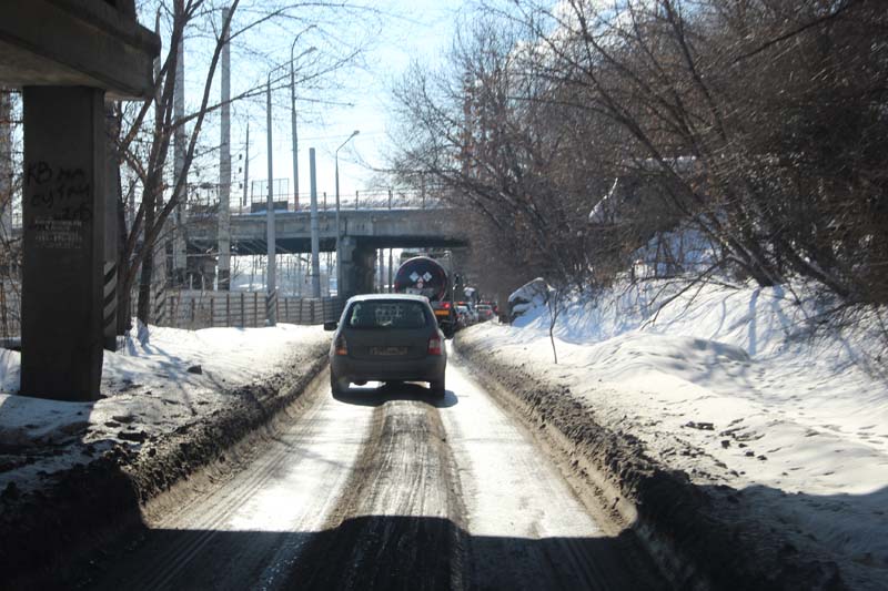 По оживленной развязке, ведущей от Соколовой через путепровод к улице Тракторной, движение осуществляется в один ряд. По краям от колеи проезжая часть покрыта толстым слоем снега, и создается ощущение, что уборочная техника сюда ни разу не заезжала за всю прошедшую зиму, а дорогу себе пробили многочисленный автомобилисты.
