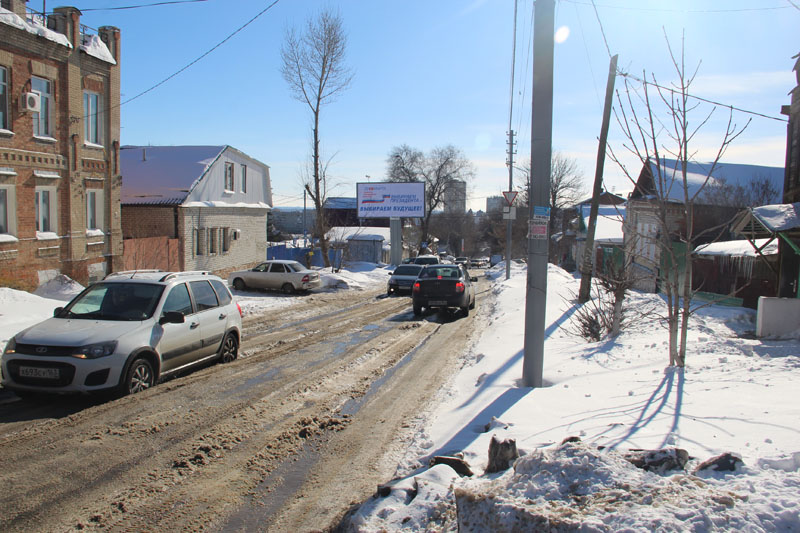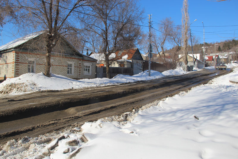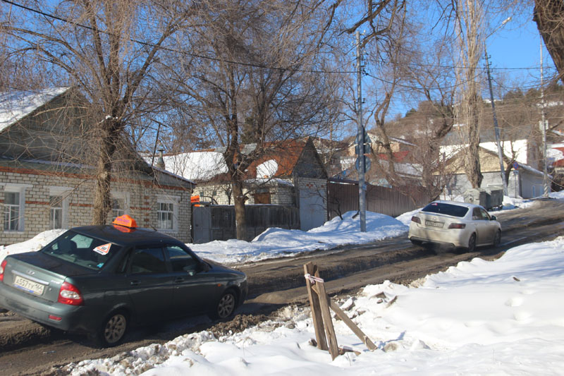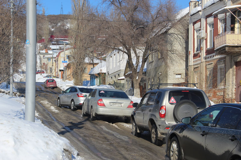 Многие саратовские водители забывают, что улица Вознесенская в Волжском районе Саратова является двусторонней на всем своем протяжении. Возможно, причина в том, что со стороны улицы Большой Горной в сторону Соколовой движется на порядок больше машин, чем навстречу. Но про встречный транспорт забыли также и дорожные службы, после снегопадов немного расчистив лишь одну, более оживленную полосу, проигнорировав остальную проезжую часть, покрывшуюся к марту многосантиметровым слоем наледи.