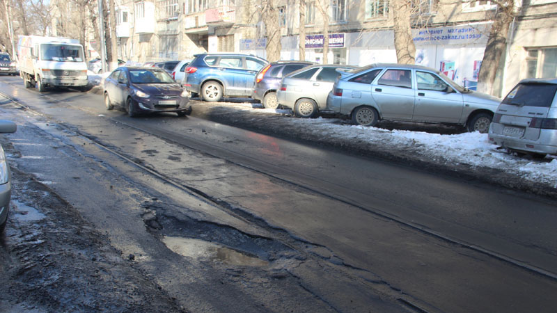 На улице Степана Разина на участке от Большой Горной до Кутякова движение транспортных средств затрудняют многочисленные ямы и выбоины. Разрушения покрытия часто соседствуют с латками от ямочного ремонта, который периодически проводят на этой оживленной дороге. Это может указывать, что были неверно рассчитаны границы подлежащего замене дорожного полотна.