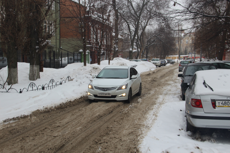К несколько другой категории дорог можно отнести улицы, где хоть какая-то расчистка проводилась, но для безопасного проезда они все равно не годятся. Отличает эти улицы один расчищенный ряд, по которому движутся в одном направлении автомобили, а встречным машинам приходится либо забираться на наледь, либо искать карманы в сугробах. Достаточно часто приходится совершать такие маневры водителям на улицах Зарубина, Гоголя, Белоглинской, Григорьева, Некрасова. На многих из них находятся как социально значимые учреждения, так и административные здания.