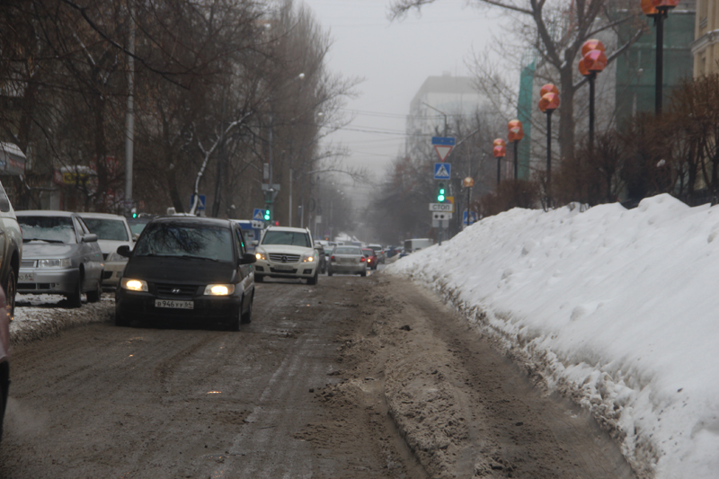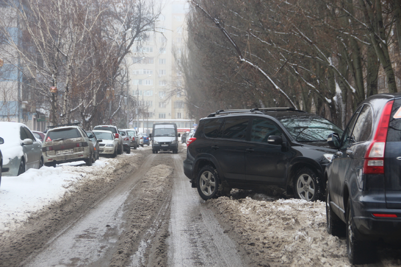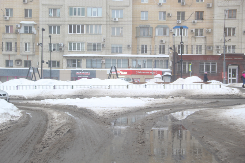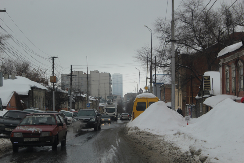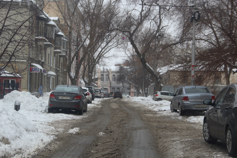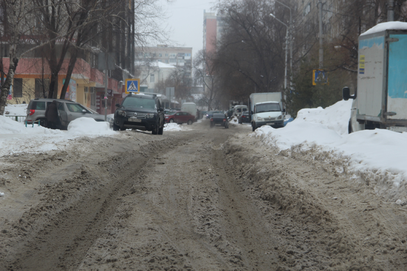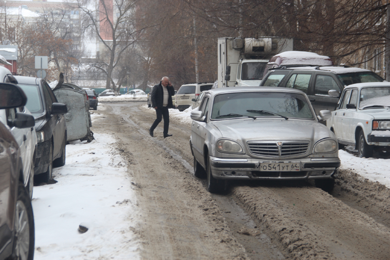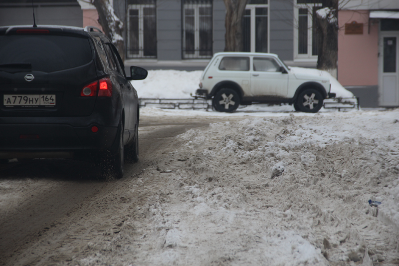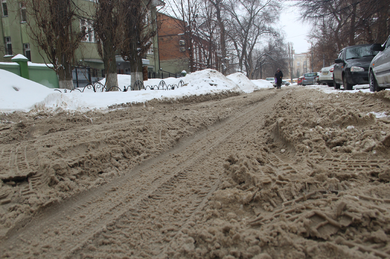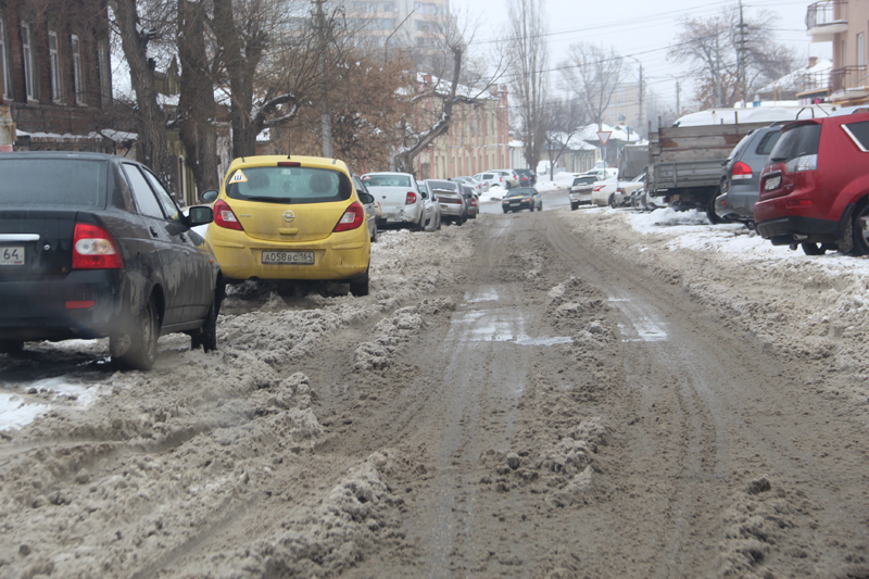 В Саратове зима не особо спешит передавать свои права солнечной и теплой весне, а вместе с ней столь же неспешно идет уборка городских дорог от наледи и снега. Многие улицы Саратова до сих пор либо плохо, либо совсем не расчищены. Исключением не стали даже улицы, находящиеся в центре города. В основном это смежные с главными транспортными артериями улицы.