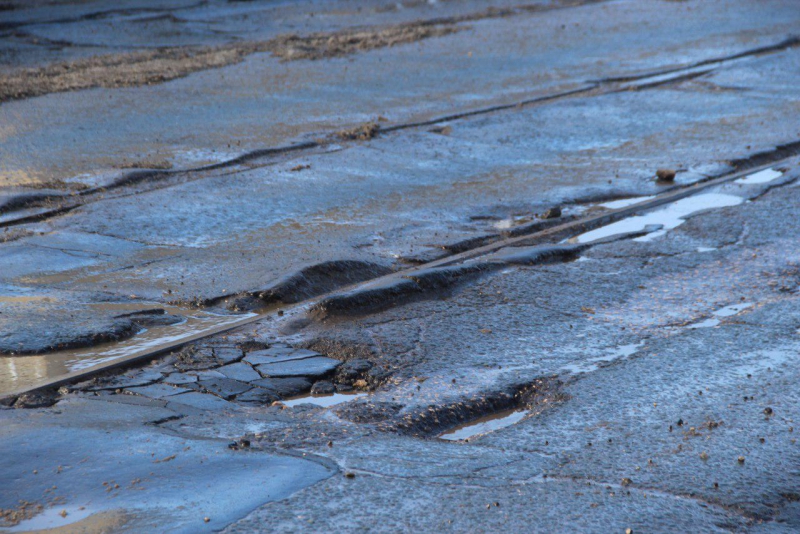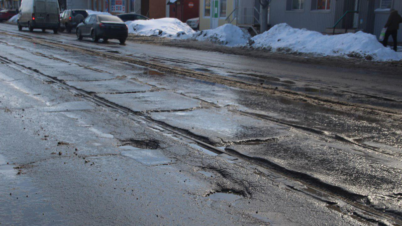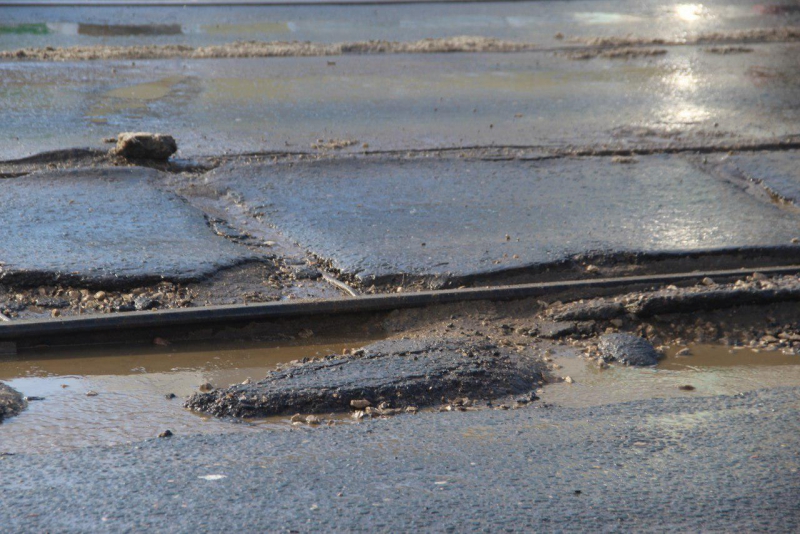 Водители предпочитают объезжать ямы по трамвайным путям попутного направления, но во многих местах вдоль рельсов асфальт бугрится, крошится и отваливается целыми кусками. Некоторые латки после ямочного ремонта, которым пытаются поддерживать в нормативном состоянии проезжую часть, покрылись трещинами и готовы рассыпаться в любой момент.
