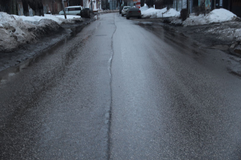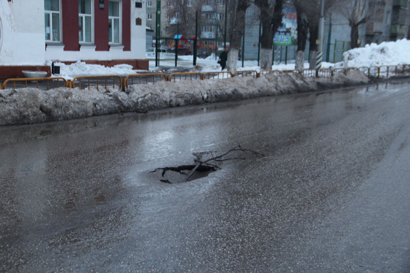 Этот отрезок проезжей части отремонтировали в 2016 году, полностью было заменено покрытие, гарантия на которое составила 3 года. Однако в целостности дорога не простояла и года. Летом 2017 года для замены трубопровода дорожное покрытие было вскрыто. Каким образом получилось, что новая дорога тут же попала под демонтаж, нужно поинтересоваться у бывших городских руководителей. Осенью 2017 года вскрышные работы завершились, и коммунальщики восстановили твердое покрытие дороги. Качество этих работ таково, что они не прошли испытание зимой и первыми талыми водами. Напротив школы №1 по центру проезжей части сейчас зияет провал. Пока препятствие обозначено воткнутой веткой, которую уже сломали и раздавили автомобилисты, потому что опасный дефект в темное время суток на сырой дороге становится почти незаметным.